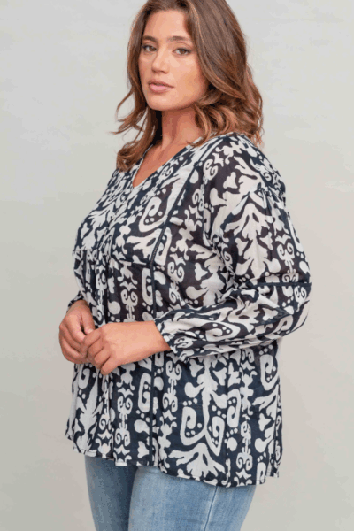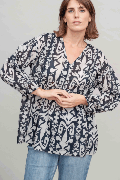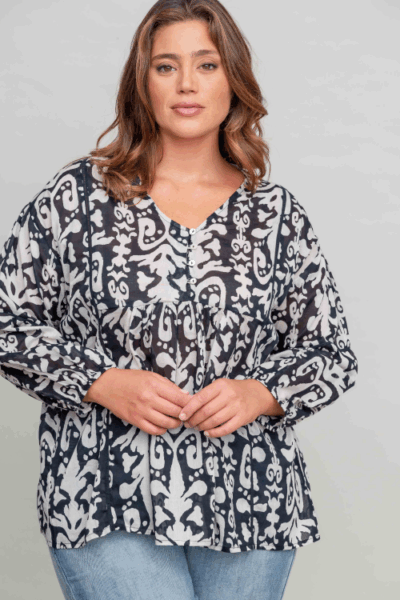 חולצה עם חיתוך בחזה, כפתורים ופס רקמה לאורך החולצה