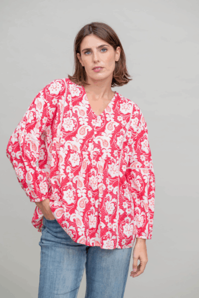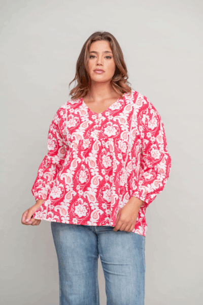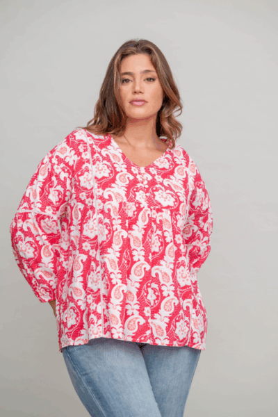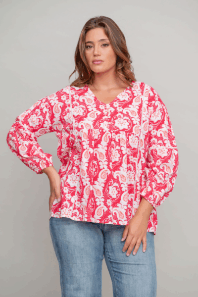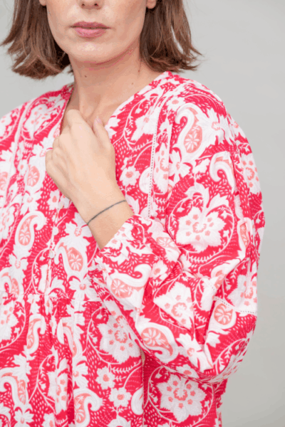 חולצה עם חיתוך בחזה, כפתורים ופס רקמה לאורך החולצה