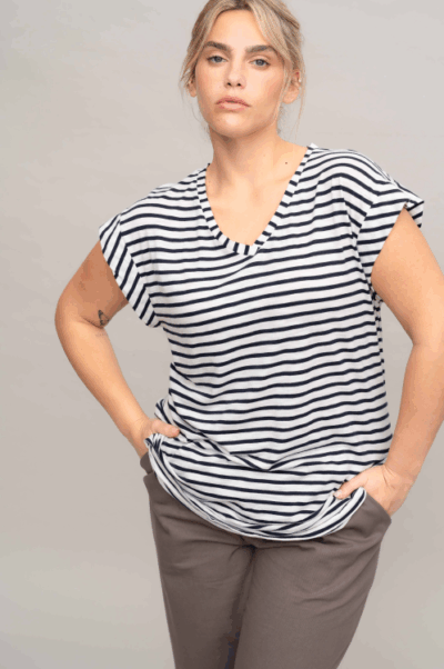 חולצת בייסיק עם מחשוף וי, שרוול קטן ושליץ בצד.