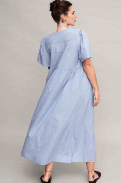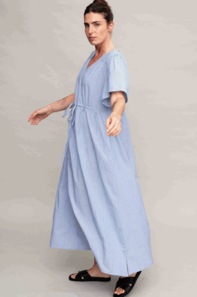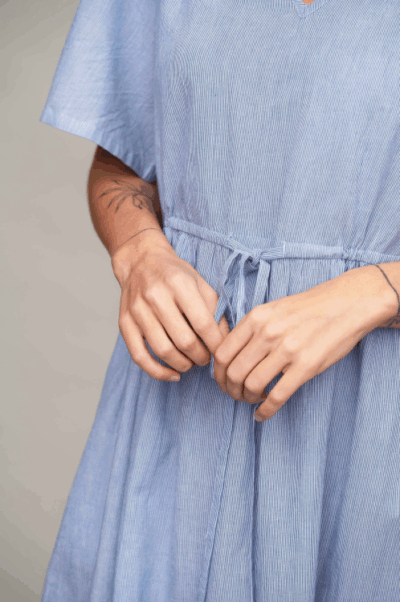 שמלת גלביה עם מחשוף וי, שרוך לכיווץ במותן וכיסים.