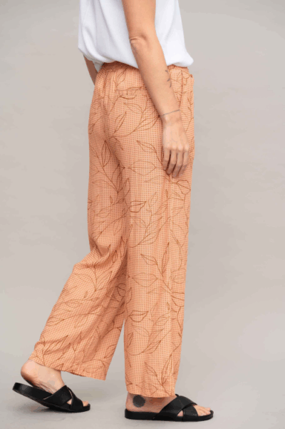 מכנסיים בגזרה משוחררת, גבוהה ומתרחבת.
